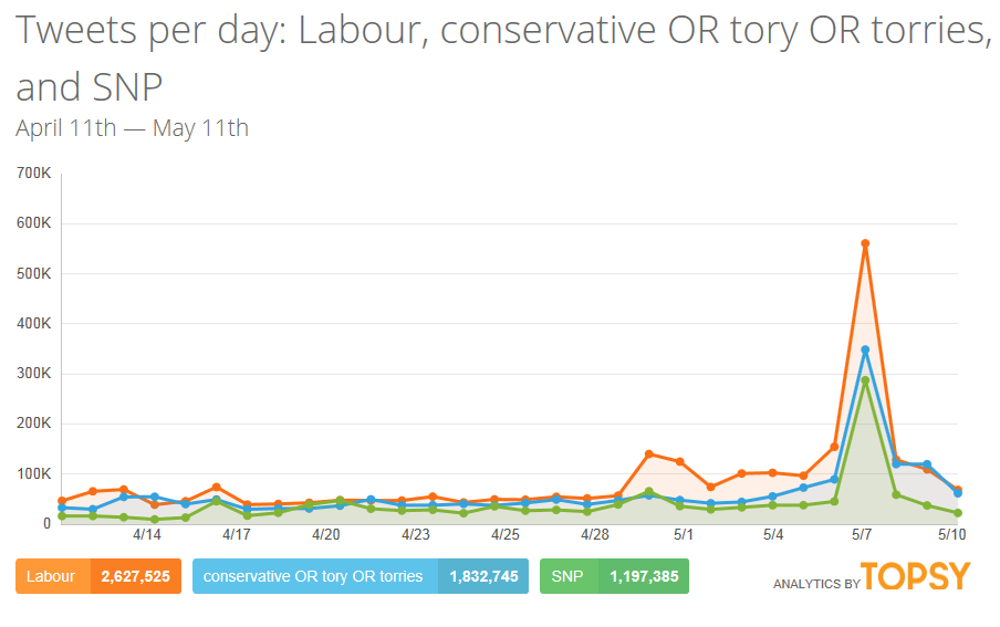 Despite the graphs not being absolute – we haven’t corrected for keywords such as “labour”, “conservative”, “tory “and “SNP” being used in other contexts) – it still gives us a good indication on how the parties performed on social media. It came to no surprise to see the Labour party being mentioned a lot more on social media; this comes naturally as labour party voters are more active on social media than other party voters.
