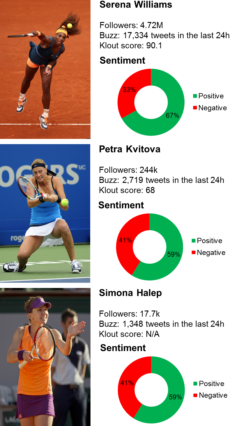 The charts show it’s not just on the tennis court where Serena Williams, winner of the last three Grand Slams dominates. She has consistently generated significantly more buzz than her rivals over the past 30 days and is head and shoulders, above Kvitova and Halep in terms of the sentiment analysis for these conversations.